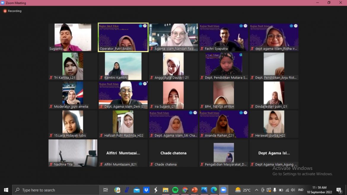 Sabtu, 10 September 2022 Himpunan Mahasiswa Jurusan PGSD 2022/2023 mengadakan acara Kajian Studi Islam (KSI) yang mengangkat tema “Mari Ta’aruf (Mari Memahami Tajwid dan Makhrijul Huruf)” dengan mendatangkan pemateri Al-ustadz Sugianto S.Pd.i,. M.A. yang merupakan salah satu dosen agama Islam PGSD. Kajian yang diadakan pada pukul 09.00-12.15 WIB ini berlangsung dengan aktif yang dihadiri 67 peserta yang ikut berkontribusi dalam memeriahkan Kajian Studi Islam yang diadakan oleh Departemen Agama Islam. Kajian ini dihadiri langsung oleh Wakil Dekan III FIP Bidang Kemahasiswaan yaitu Ibu Kamtini S.Pd.,M.Pd., Pembina HMJ yaitu Bapak Syahrial, M.Pd, dan dihadiri Wakil Ketua HMJ yaitu Yusron Abda’u Ansya.